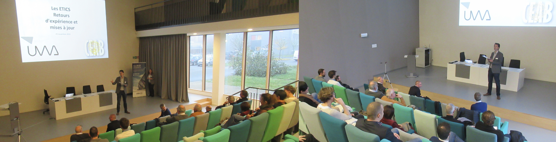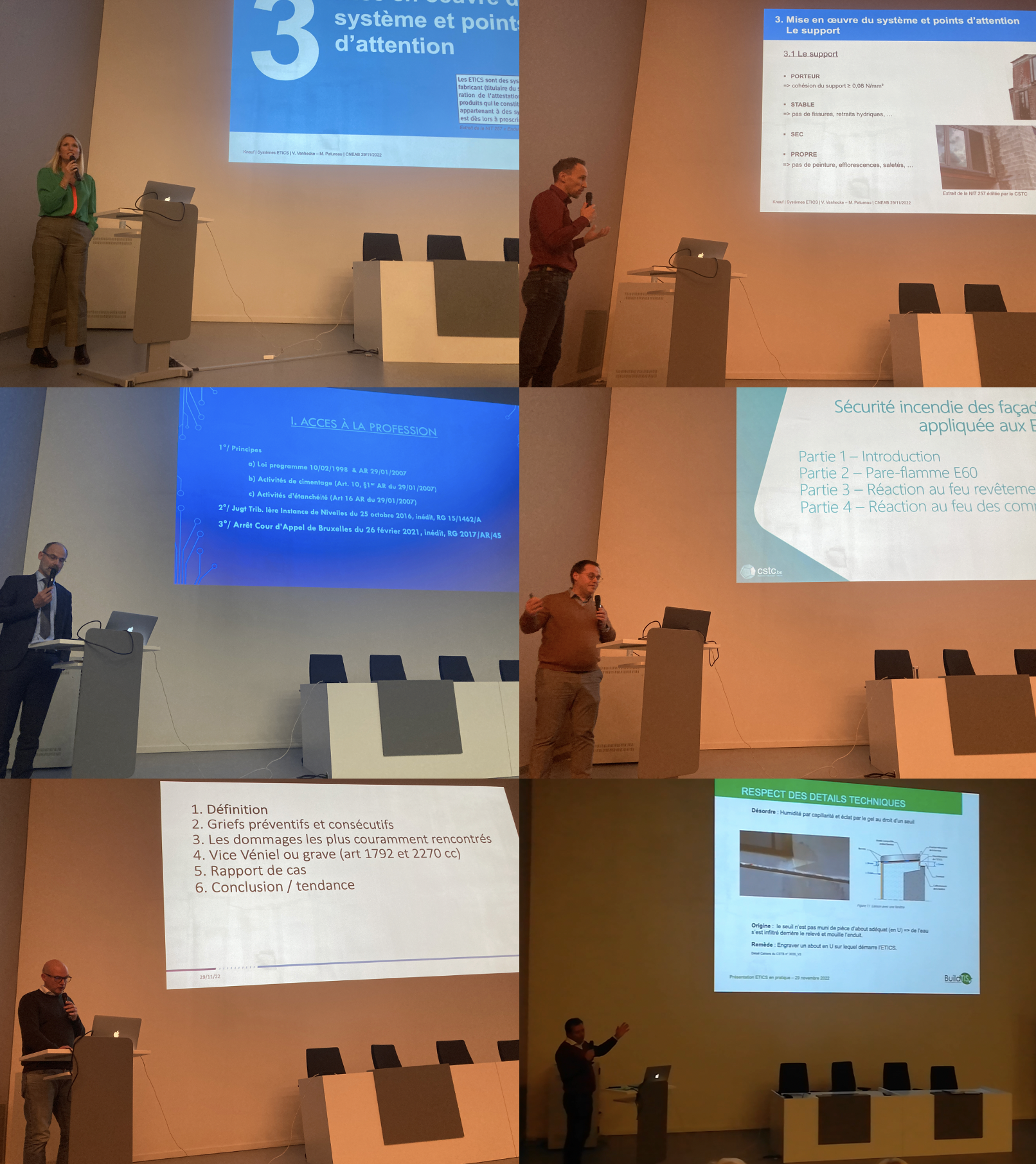 En effet, si cette technique constructive a le vent en poupe, et notamment à la suite des renforcements successifs des normes PEB, force est de constater qu’après quelques années, le résultat devient parfois décevant pour les propriétaires et pour l’architecte également : De nombreuses pathologies se manifestent telles les verdissements, fissurations, décollements… Tous ces thèses ont été approchées sous l’angle du fabricant, du Centre Scientifique et Technique de la Construction (BUILDWISE), du bureau de contrôle, de l'assureur et de l’avocat.en fin de cession un débat permettant aux participants de poser des questions aux intervenants.