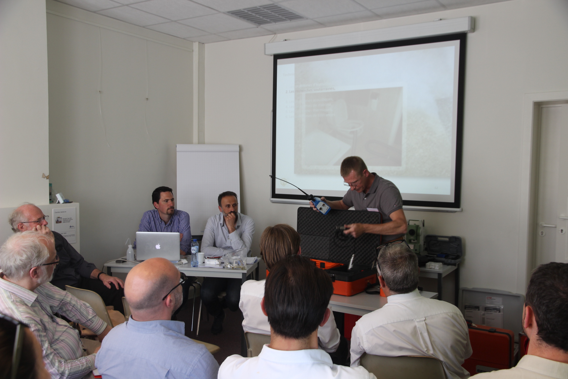 Le but des présentations, réalisées par les confrères IODICE (Président du CEAB) et BOURGOIS (Vice-Président), avec l'aimable participation des firmes INFRASONOR et TESTO était de faire découvrir plusieurs techniques d’investigation que tout expert qui doit donner un avis technique est susceptible d’utiliser et dont il devrait maîtriser les principales caractéristiques ou, au minimum en comprendre les tenants et aboutissants. Il arrive que l’expert judiciaire y soit confronté dans divers rapports écrits par des conseils techniques. Il devra alors en contrôler les conditions d’utilisation avant d’en analyser les résultats. Certaines de ces techniques sont simples et peu couteuses. D’autres sont assez complexes (et plus couteuses). Ces dernières peuvent nécessiter de faire appel à un sapiteur.
